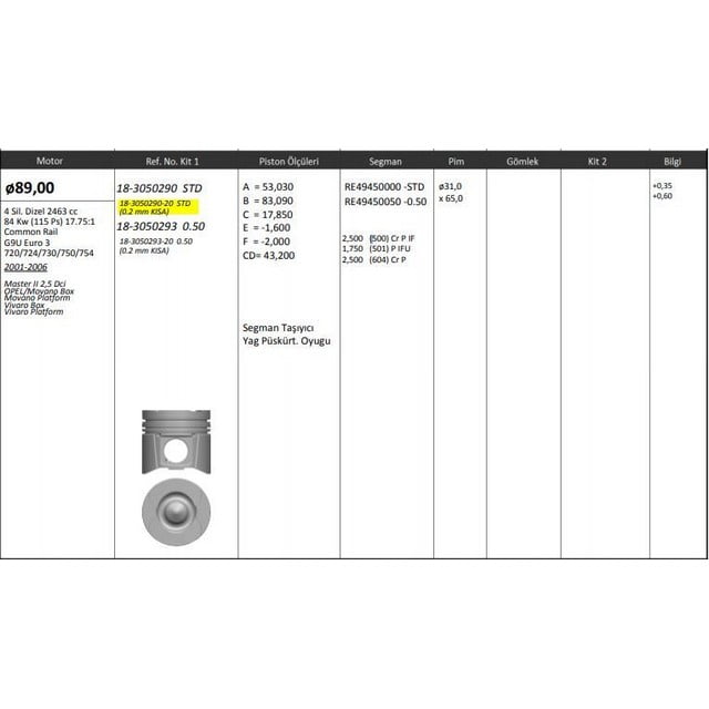 Piston Segman 89.00Mm Std 0.20 Kısa Master II Trafıc Movano Rıken Segmanlı Renault Master KNG-18-3050290-20 7701477121