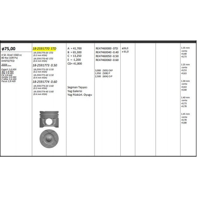 Piston Segman Std 206 207 3008 307 307 308 407 Expert III Partner Tepe Berlıngo B9 C2 C3 C4 C5 Jumpy C-Max Focus Dv6Ted 1.6 Hdı Rıken Segmanlı Peugeot 207 KNG-18-2591770 0628V1